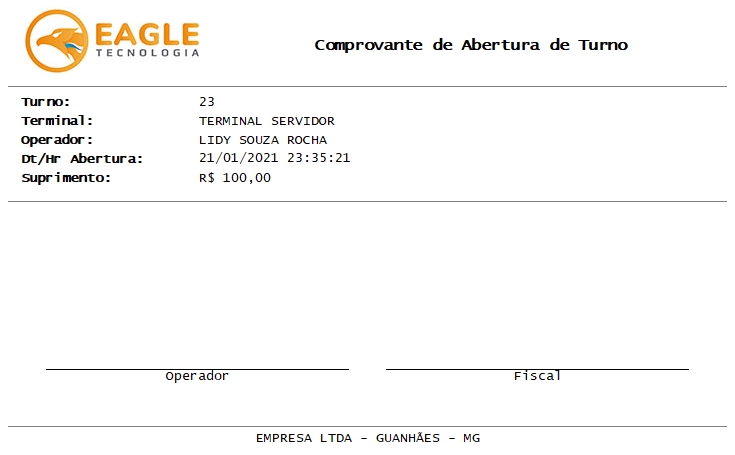 Quando a opção Imprimir comprovante de abertura e fechamento de turno está marcada no cadastro do terminal, após a abertura do turno, é impresso o comprovante de abertura na impressora padrão conforme o modelo do comprovante configurado no cadastro do terminal.