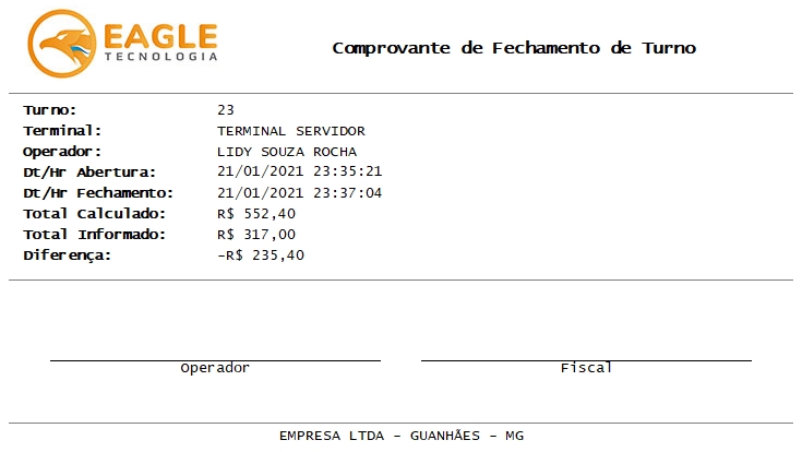 Quando a opção Imprimir comprovante de abertura e fechamento de turno está marcada, após o fechamento do turno, é impresso o comprovante de fechamento na impressora padrão conforme o modelo do comprovante configurado no cadastro do terminal.