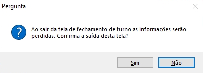 Se o usuário clicar em não a tela de fechamento do turno permanece aberta e com os valores informados para cada meio de pagamento. Caso ele clique em sim, a tela é fechada e os valores serão zerados.